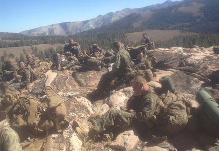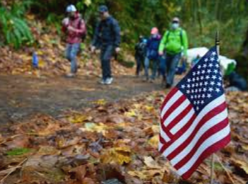 An adventurous group hike in a lush forest setting with vibrant green surroundings.